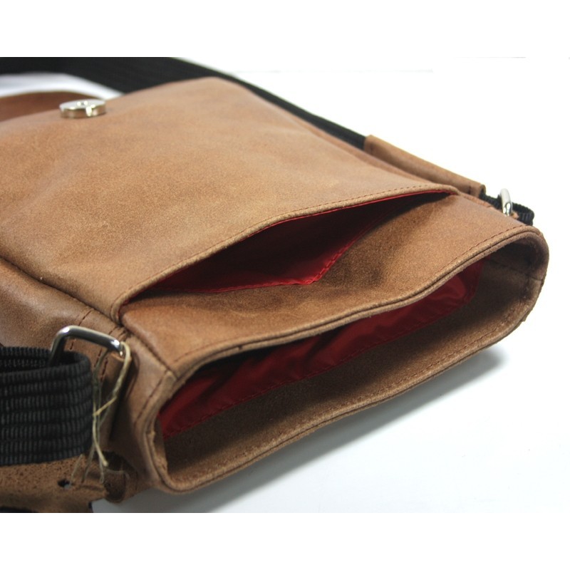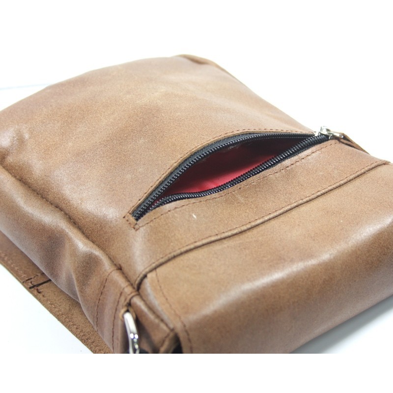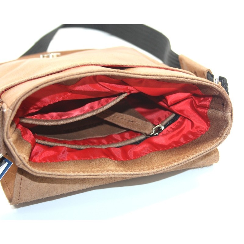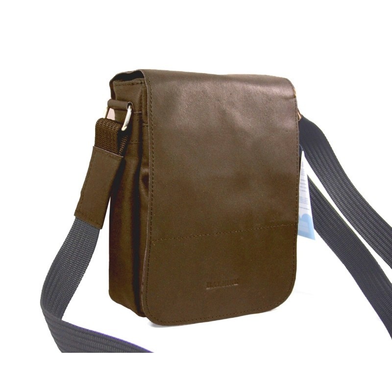 Stylowa i pojemna saszetka męska na ramię ze skóry naturalnej. Niezbędna na telefon, portfel, klucze i inne drobiazgi. Torebka w kolorze ciemnobrązowym z czerwoną podszewką.